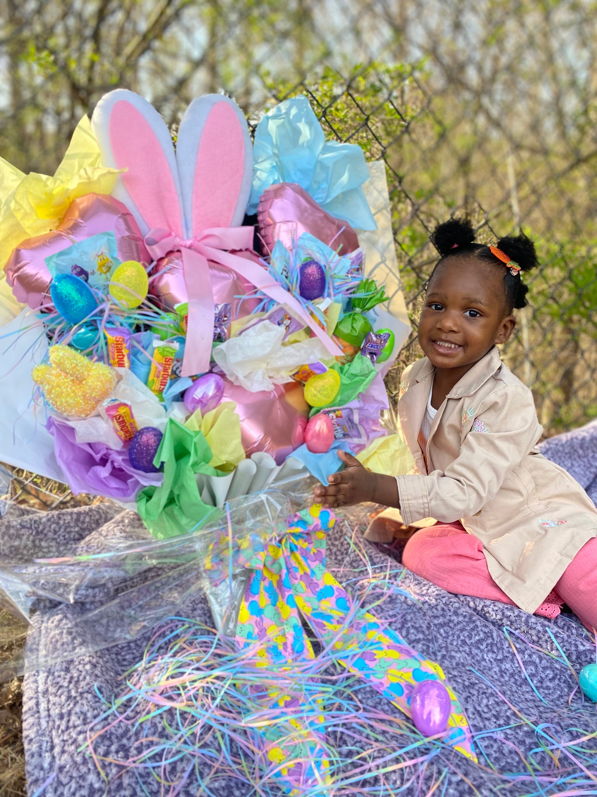 ✔️ Assorted foil balloons in varying sizes, shapes, and colors ✔️ Custom wrapping paper base with paper filler ✔️ Coordinating ribbon or bow ✔️ Ranges from 2-3 ft tall, depending on design